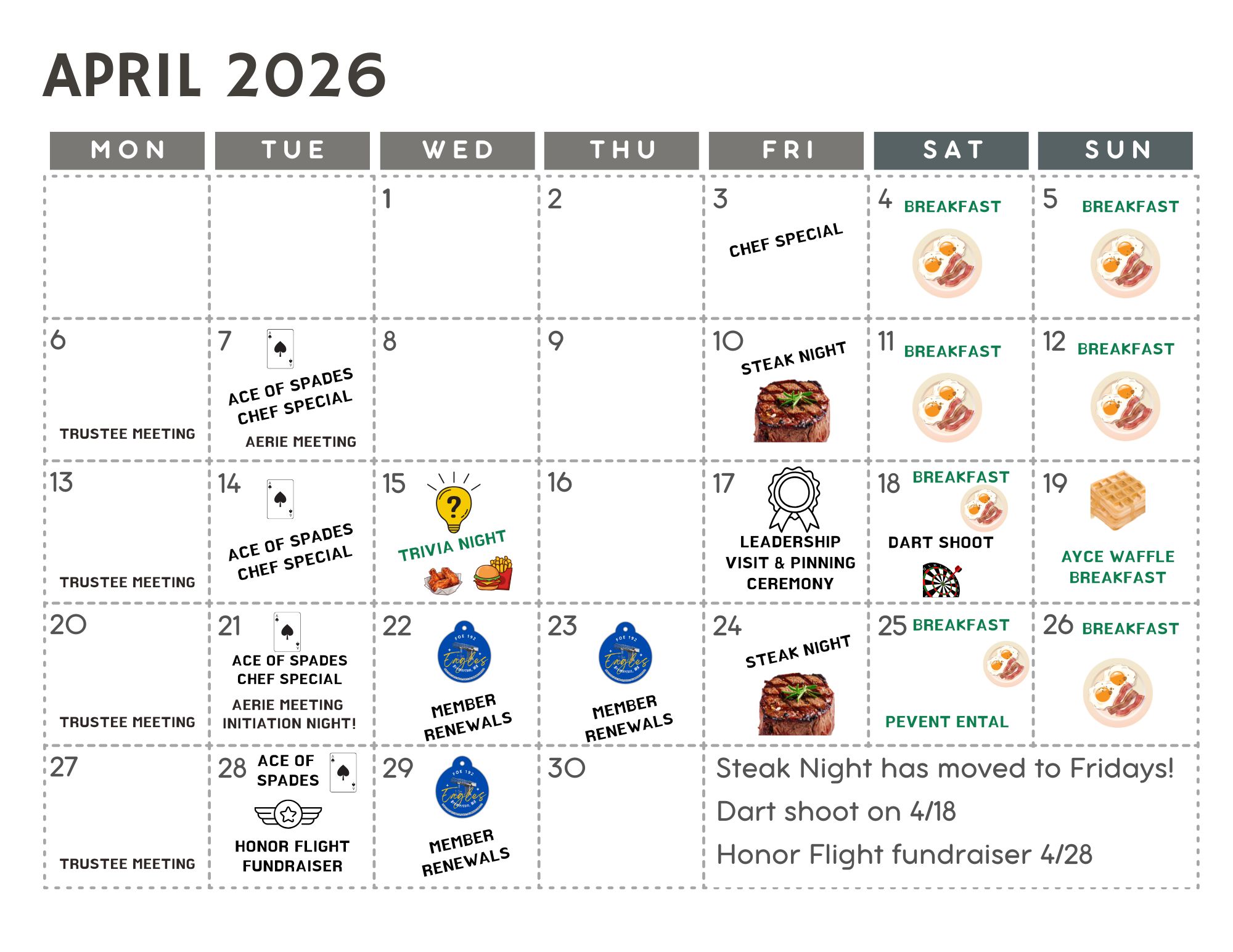 Join us for Steak Night on the 1st & 3rd Mondays. Enjoy a delicious steak dinner for just $15. Bring your friends, support the FOE, and enj...